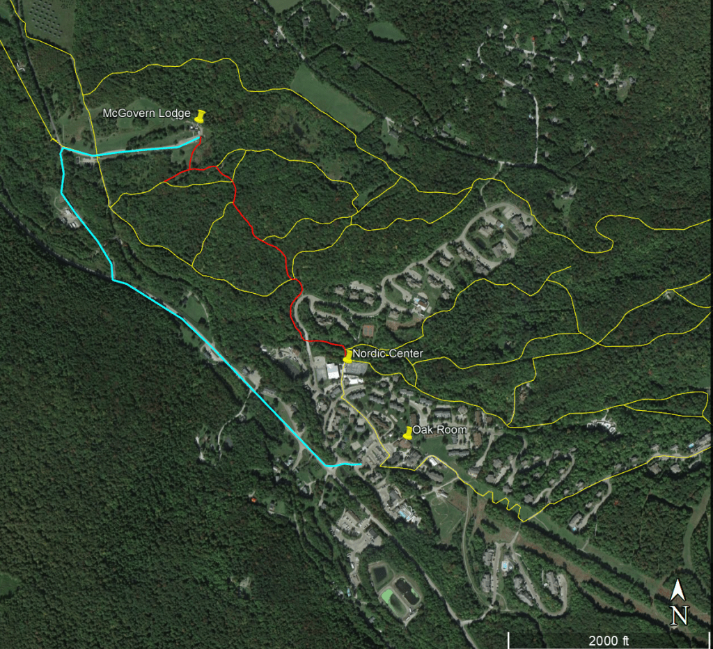 The workshop will take place at McGovern Lodge, the yellow house at 1239 Edwards Road where Smuggs’ ArborTrek zip-line tours are based. Look for our club signboard. You can XC ski or snowshoe there (XC map at this link, overview map below); it’s about ¾ of a mile from the Village Center. Parking is available at McGovern Lodge.